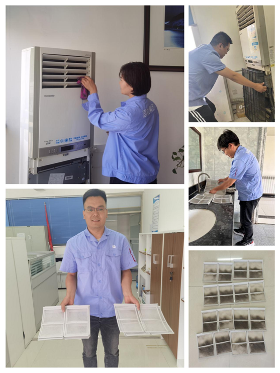 在活動現(xiàn)場,志愿者們分工明確,配合密切,拆卸空調(diào)外殼、清洗空調(diào)濾網(wǎng)、擦拭空調(diào)外機,經(jīng)過一下午有條不紊的清洗活動,辦公室和會議室的空調(diào)從內(nèi)到外煥然一新。“沒想到空調(diào)濾網(wǎng)這么臟”“太好了,終于能放心開空調(diào)了”,看著沖洗出的灰塵污漬,員工們對志愿者助人為樂、無私奉獻的精神紛紛表示感謝和贊揚。