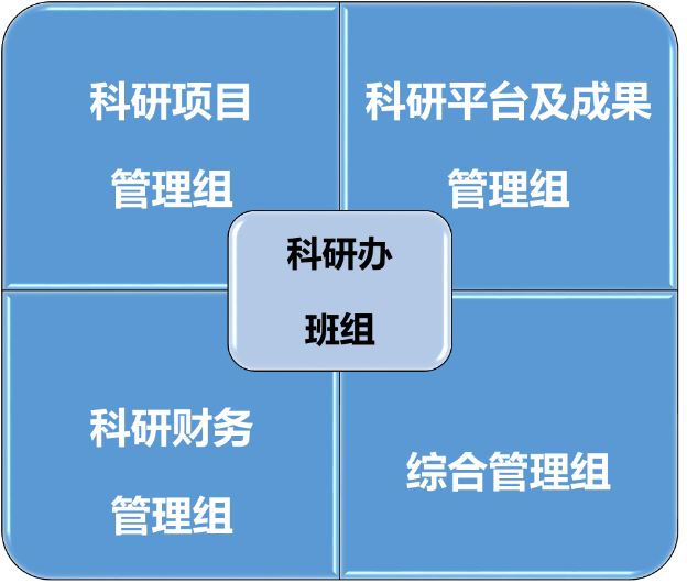 傳統(tǒng)的組織結(jié)構(gòu)多為金字塔式,缺少班組的自主性管理和運(yùn)營??蒲修k公室積極嘗試“圓桌式組織結(jié)構(gòu)”,將班組內(nèi)部劃分為四個(gè)管理小組,分別為科研項(xiàng)目管理組、科研平臺及成果管理組、科研財(cái)務(wù)管理組、綜合管理組,每個(gè)人根據(jù)其主要負(fù)責(zé)的任務(wù),既是負(fù)責(zé)領(lǐng)域內(nèi)的組長,同時(shí)又是其他小組中的組員,組長及副組長對本組成員具有本組工作職責(zé)內(nèi)的部分考核權(quán)及任務(wù)分配建議權(quán)。