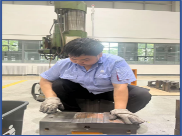 “足蒸暑土氣,背灼炎天光”,走進(jìn)車間,師傅們臉頰上混雜著汗水和黑色的印痕,淺藍(lán)的衣服早已變成深藍(lán)。即便如此,設(shè)備開(kāi)發(fā)部師傅們也未曾有絲毫的懈怠,嚴(yán)肅的神情和精湛的技藝彰顯著工科人的細(xì)致和專業(yè):整齊擺放的物料嚴(yán)陣以待,調(diào)試好的零件精益求精。機(jī)器的轟鳴和師傅們的吶喊交相呼應(yīng),形成了盛夏中別具一格的交響樂(lè)。
