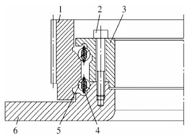 1—外圈壓板螺釘;2—外圈壓板;3—外圈;4—鋼球;5—軸承座;6—內(nèi)圈壓板;7—內(nèi)圈壓板螺釘;8—保持架;9—內(nèi)圈;10—CT機主軸。