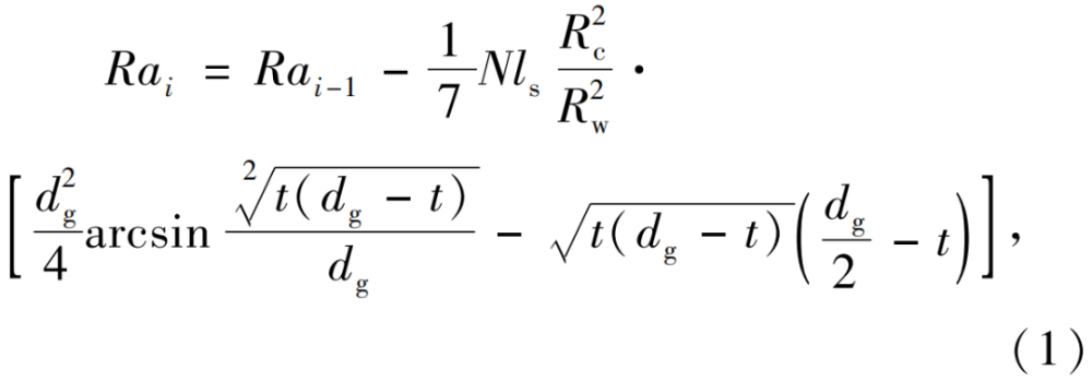 在磨料流加工中,假定工件內(nèi)表面輪廓均勻,初始表面粗糙度為Ra0,并且磨料在壓力作用下沿工件內(nèi)孔的軸線方向往復(fù)移動(dòng),劃痕方向上的峰谷粗糙度Rt0與算術(shù)平均表面粗糙度Ra比值恒定。假定Rai為第i次加工后獲得的內(nèi)孔表面粗糙度,其模型可由(1)式計(jì)算,即
