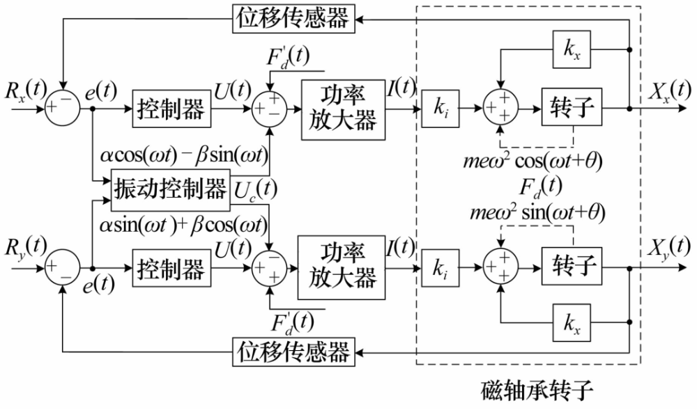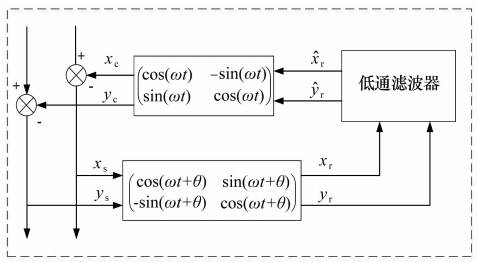 2015年,文獻(xiàn)[18]將電動(dòng)機(jī)傳動(dòng)控制中同步旋轉(zhuǎn)坐標(biāo)系(Synchronous Rotating Frame,SRF)變換的方法應(yīng)用于磁軸承系統(tǒng),其控制原理如圖7所示,相當(dāng)于一種新型的陷波濾波器,通過(guò)與控制器串聯(lián)工作在轉(zhuǎn)子低速旋轉(zhuǎn)時(shí)有良好的同步抑振性能。