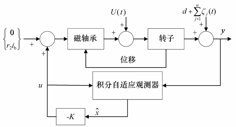 另外,文獻(xiàn)[26]提出了一種基于頻域自適應(yīng)LMS算法的諧波振動(dòng)抑制方法,對(duì)每個(gè)權(quán)值設(shè)置相應(yīng)的步長(zhǎng)并實(shí)時(shí)調(diào)整,在保證穩(wěn)態(tài)精度的同時(shí)提高了收斂速度。文獻(xiàn)[27]提出了一種新的積分自適應(yīng)觀測(cè)器(圖9),用于識(shí)別傳感器誤差的直流和諧波含量并同時(shí)估計(jì)系統(tǒng)狀態(tài),試驗(yàn)表明當(dāng)系統(tǒng)同時(shí)受到測(cè)量誤差和不平衡干擾時(shí)能有效減小位移和電流幅值。文獻(xiàn)[28]提出了一種針對(duì)低次主導(dǎo)諧波的通用選擇分?jǐn)?shù)階重復(fù)控制方法,實(shí)現(xiàn)了任意轉(zhuǎn)速下快速高精度的諧波電流抑制。